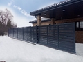 Модульный забор под «жалюзи» выглядит объемно и одновременно «легко».