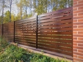 Забор «жалюзи» производится в разных цветовых решениях, в том числе цвета под дерево, что придает ограждению натуральный естественный вид. Матовые и глянцевые покрытия ламелей. Элементы ограждения собираются как конструктор, что позволяет выполнить монтаж своими силами.