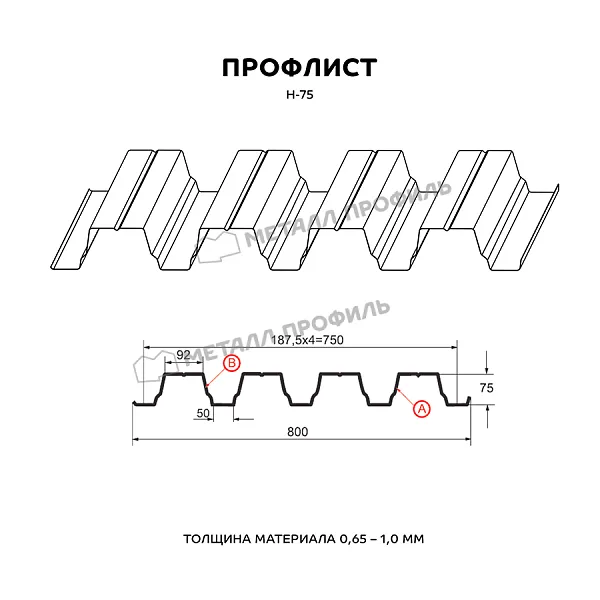 Профлист МЕТАЛЛ ПРОФИЛЬ Н-75x750-B (ПЭ-01-1018-0,7) широко применяется для монтажа профилированного листа. Представляет собой лист оцинкованной стали с покрытием. Общая толщина металла с цинковым и декоративно-защитным покрытием составляет 0.7 мм. Проходя процедуру холодного проката, металл приобретает рисунок из ритмичных волн. Такая конфигурация придает профилю несущую способность.